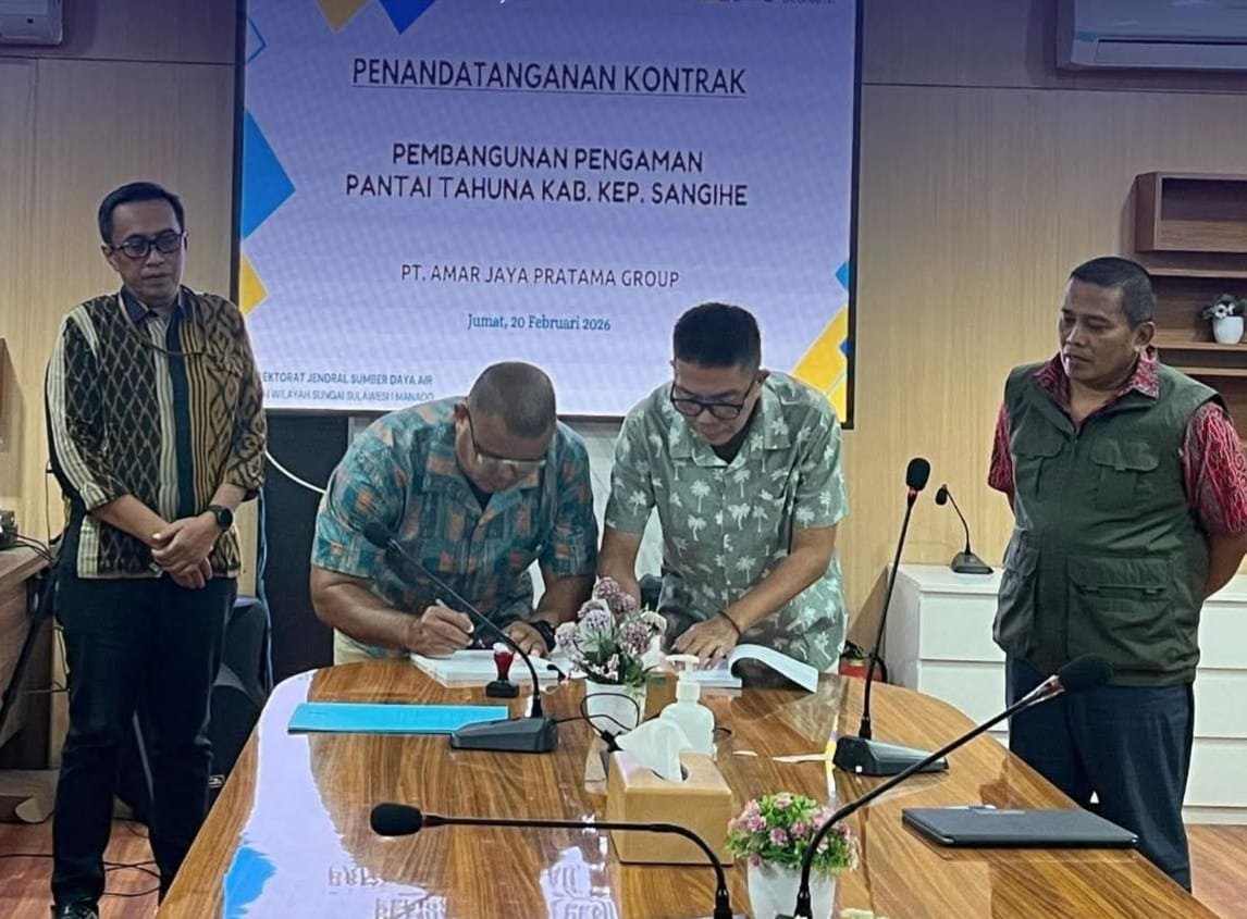 Sulutone.co.id-Balai Wilayah Sungai Sulawesi I Manado melalui PK Sungai dan Pantai III SNVT Pelaksanaan Jaringan Sumber Air secara resmi melaksanakan penandatanganan kontrak Pekerjaan Pembangunan Pengaman Pantai Tahuna di Kabupaten Kepulauan Sangihe. Jumat (20/02/2026).