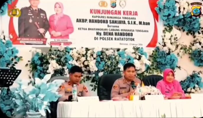 Sulutone.co.id-Kapolres Polres Minahasa Tenggara AKBP Handoko Sanjaya, S.I.K., M.Han., bersama Ketua Bhayangkari Cabang Polres Mitra, Ny. Dena Handoko, serta Pejabat Utama (PJU) melaksanakan kunjungan kerja dalam rangka silaturahmi dan tatap muka di Polsek Belang dan Polsek Ratatotok, Kamis (12/2/2026).