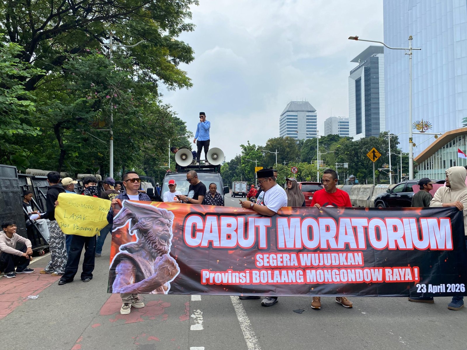 Sebanyak 50 orang yang tergabung dalam Aliansi Percepatan Pembentukan Pemekaran Provinsi Bolmong Raya (AP3BMR) serta aktivis dan mahasiswa peduli pemekaran, menggelar aksi unjuk rasa di depan Istana Merdeka, Jakarta Pusat, pada Kamis, 23 April 2026 siang tadi.